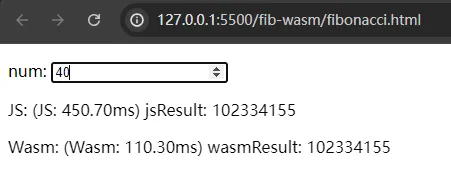 <body> <p>num: <input type="number" id="num"></p> <p>JS: <span id="JSresultDom"></span></p> <p>Wasm: <span id="WasmresultDom"></span></p> <script src="fibonacci.js"></script> <script> function _fibonacciJS(n) { if (n == 1 || n == 2) { return 1; } return _fibonacciJS(n - 1) + _fibonacciJS(n - 2); } num.onchange = () => {